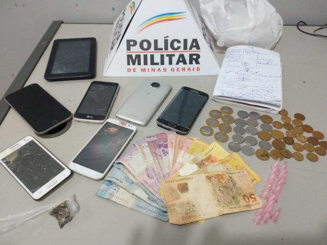 As viaturas então deslocaram ao local denunciado, onde o autor avistou a chegada das guarnições policiais e evadiu pelos telhados das casas vizinhas. Na residência foi localizado pelos militares, no forro de um sofá, a quantia de R$ 237,80 (duzentos e trinta e sete reais e oitenta centavos), 07 celulares e um caderno com possíveis anotações referentes ao tráfico de drogas. Ainda nos fundos, próximo ao muro onde o autor evadiu, foi localizada no chão uma sacola contendo 19 pinos com substância análoga à cocaína.