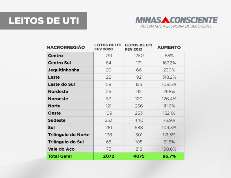 Desde o início da pandemia, o Governo de Minas praticamente dobrou o número de leitos de UTI, passando de 2.072 para mais de 4 mil.