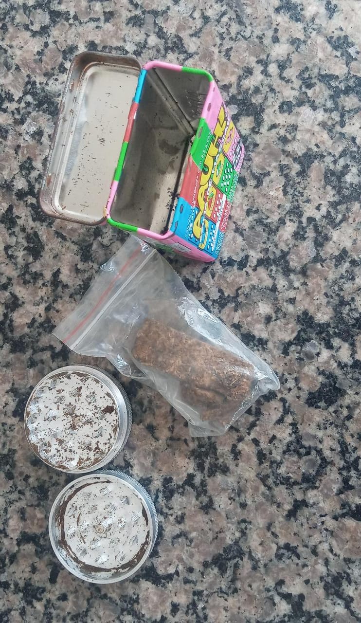 Foram localizados com os envolvidos um tablete de maconha, além de outros materiais para uso de drogas.