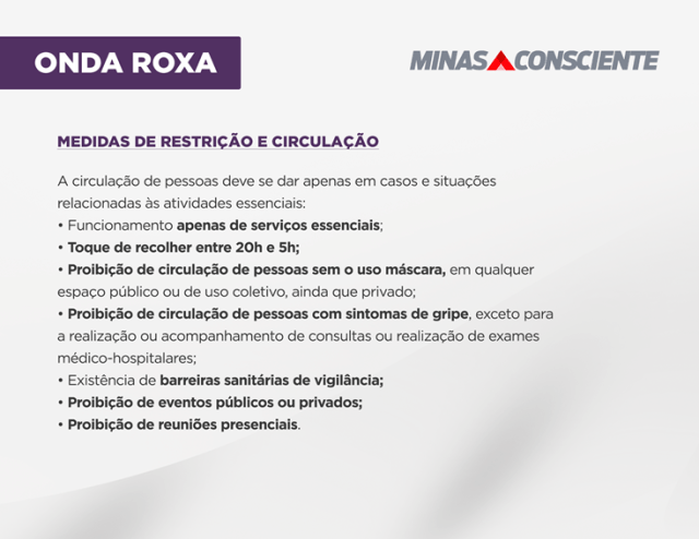 As regras para os municípios que estiverem na onda roxa incluem a proibição de circulação de pessoas sem o uso de máscara de proteção, em qualquer espaço público ou de uso coletivo, ainda que privado; a proibição de circulação de pessoas com sintomas gripais, exceto para a realização ou acompanhamento de consultas ou realização de exames médico-hospitalares; a proibição de realização de reuniões presenciais, inclusive de pessoas da mesma família que não coabitam; além da realização de qualquer tipo de evento público ou privado que possa provocar aglomeração, ainda que respeitadas as regras de distanciamento social.