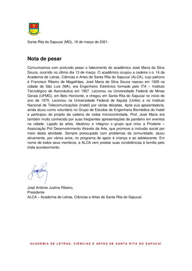 Nota de pesar – Acadêmico José Maria da Silva Souza