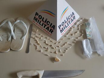 Durante verificação no local onde os infratores estavam foram encontradas 67 pedras de crack e 01 pedra maior da mesma droga, além de embalagens plásticas, 01 sofá e 02 facas.