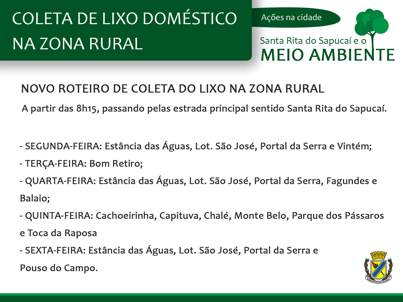 O projeto de coleta de lixo doméstico na zona rural teve início no mês de maio de 2019 no bairro Fagundes, em seguida no bairro Bom Retiro, e desde o dia 06 de janeiro de 2020 abrange toda zona rural.