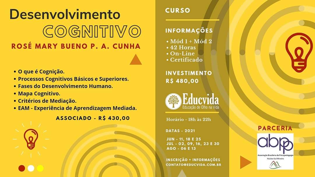 Para inscrição e pagamento até Quinta-feira, dia 20 de Maio de 2021 no Curso de Desenvolvimento Cognitivo.