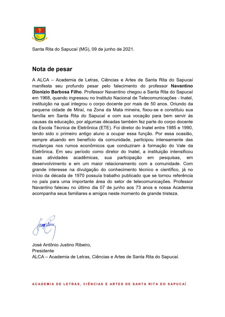 Academia de Letras – Nota de Pesar – Navantino Dionízio Barbosa Filho