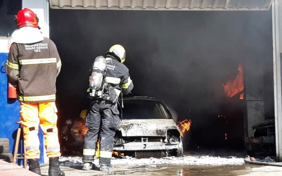 Oficina mecânica pega fogo e veículos são destruídos no bairro Faisqueira, em Pouso Alegre
