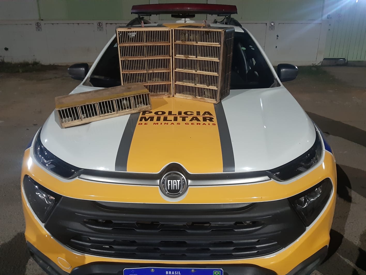 Em Santa Rita do Sapucaí, a Polícia Militar Rodoviária abordou no Km 107 da BR 459, um veículo VW Fox com um indivíduo e no porta malas foram localizados 25 pássaros Trinca Ferro em gaiolas.