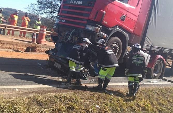 Grave acidente deixa dois mortos após carro ser prensado entre duas carretas