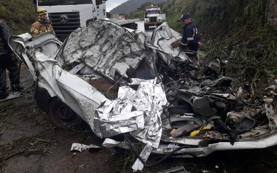 Carro é esmagado após ser atingido por máquina que caiu de carreta