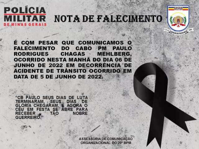 Paulo Rodrigues Chagas Mehlberg tinha 41 anos e morreu em consequência de um politraumatismo. Cabo Paulo deixa esposa e filhos.