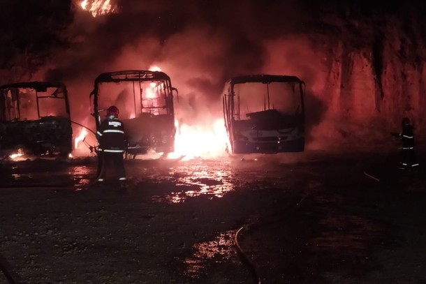 Incêndio destrói três ônibus em garagem de empresa de transporte rodoviário