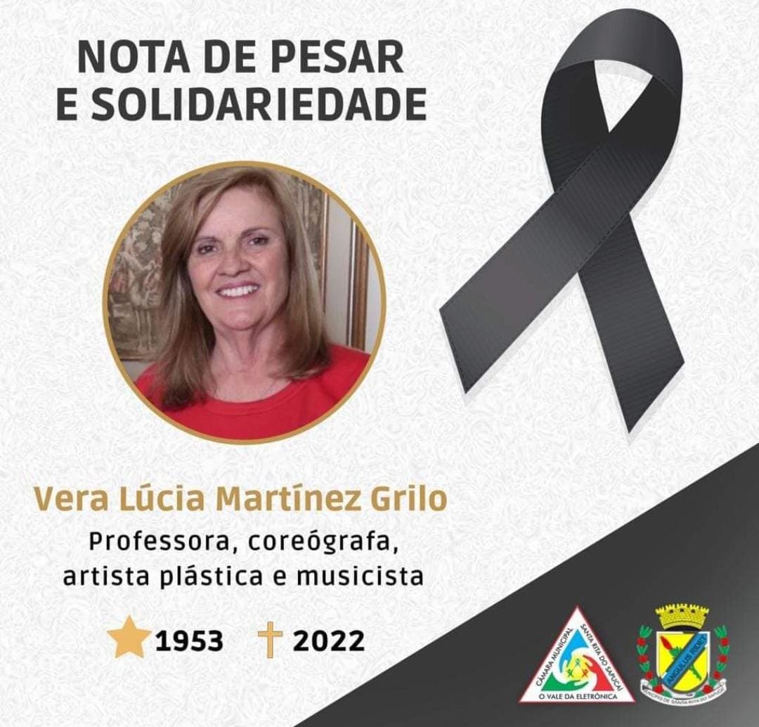 A Câmara Municipal de Santa Rita do Sapucaí lamenta profundamente o falecimento da professora, coreógrafa, artista plástica e musicista Vera Lúcia Martínez Grilo. Verinha tinha 69 anos e lutava contra um câncer. Com ancestrais de origem espanhola e italiana talentosos para diversas áreas, da culinária à fotografia, ela gostava de dizer que a arte estava em seu DNA. Graduou-se em Artes com habilitação plena em Música na capital paulista no fim da década de 1970, época em que descobriu sua vocação para a dança.
