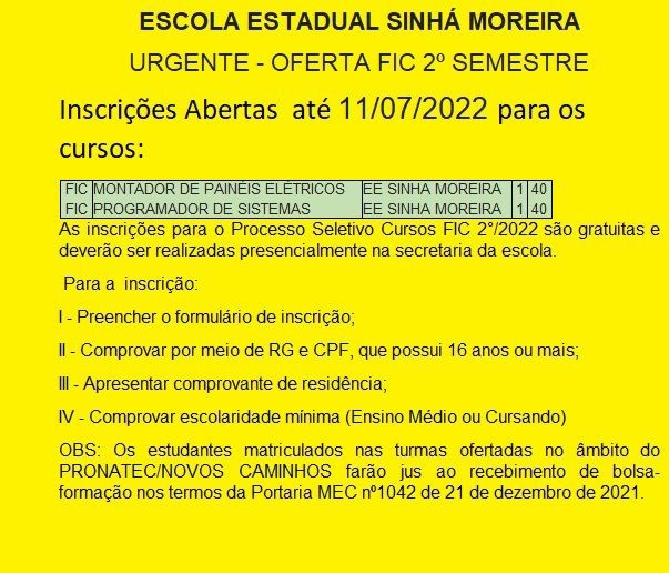 Escola Estadual Sinhá Moreira – Oferta FIC 2º Semestre