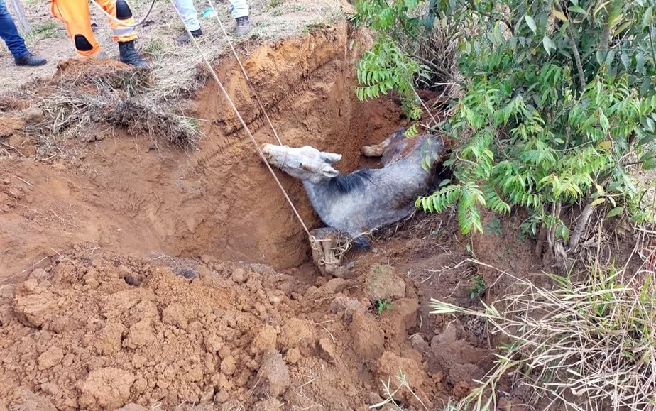 Cavalo é resgatado pelo Corpo de Bombeiros após cair em vala na zona rural de Muzambinho