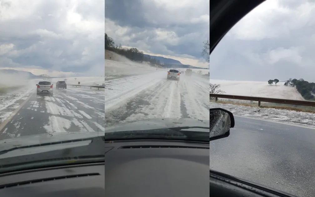 Forte chuva de granizo deixa parte da Fernão Dias ‘encoberta com neve’ em Minas
