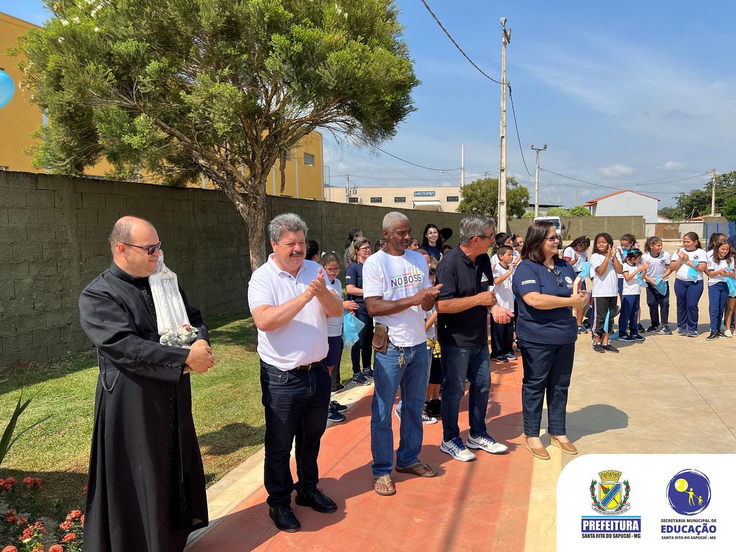 Crianças e professores da rede municipal de Educação participam da reinauguração da Gruta Nossa Senhora de Fátima no Centro de Eventos