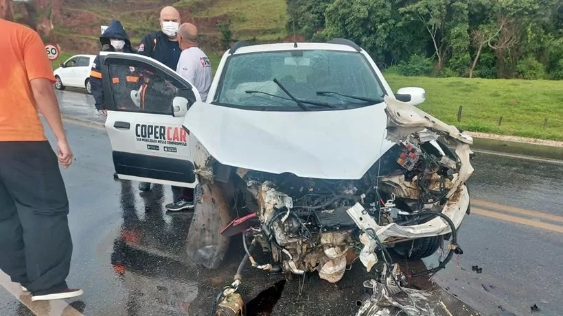 Carro derrapa na pista e bate de frente com outro na BR-459, em Itajubá