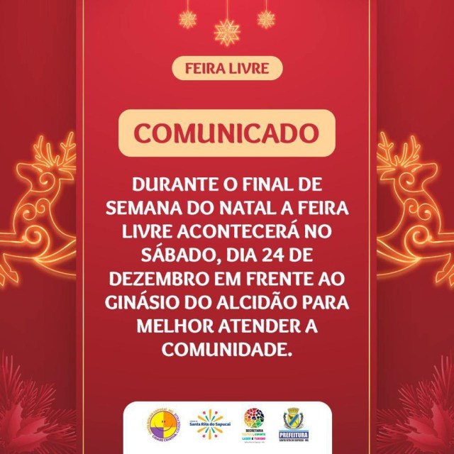 Excepcionalmente neste final de semana, a Feira Livre Municipal acontecerá amanhã, dia 24, e estará localizada em frente ao Ginásio do Alcidão das 8h ás 12h para compor a Vila do Natal com a Casa do Papai Noel que acontecem dentro do Alcidão.