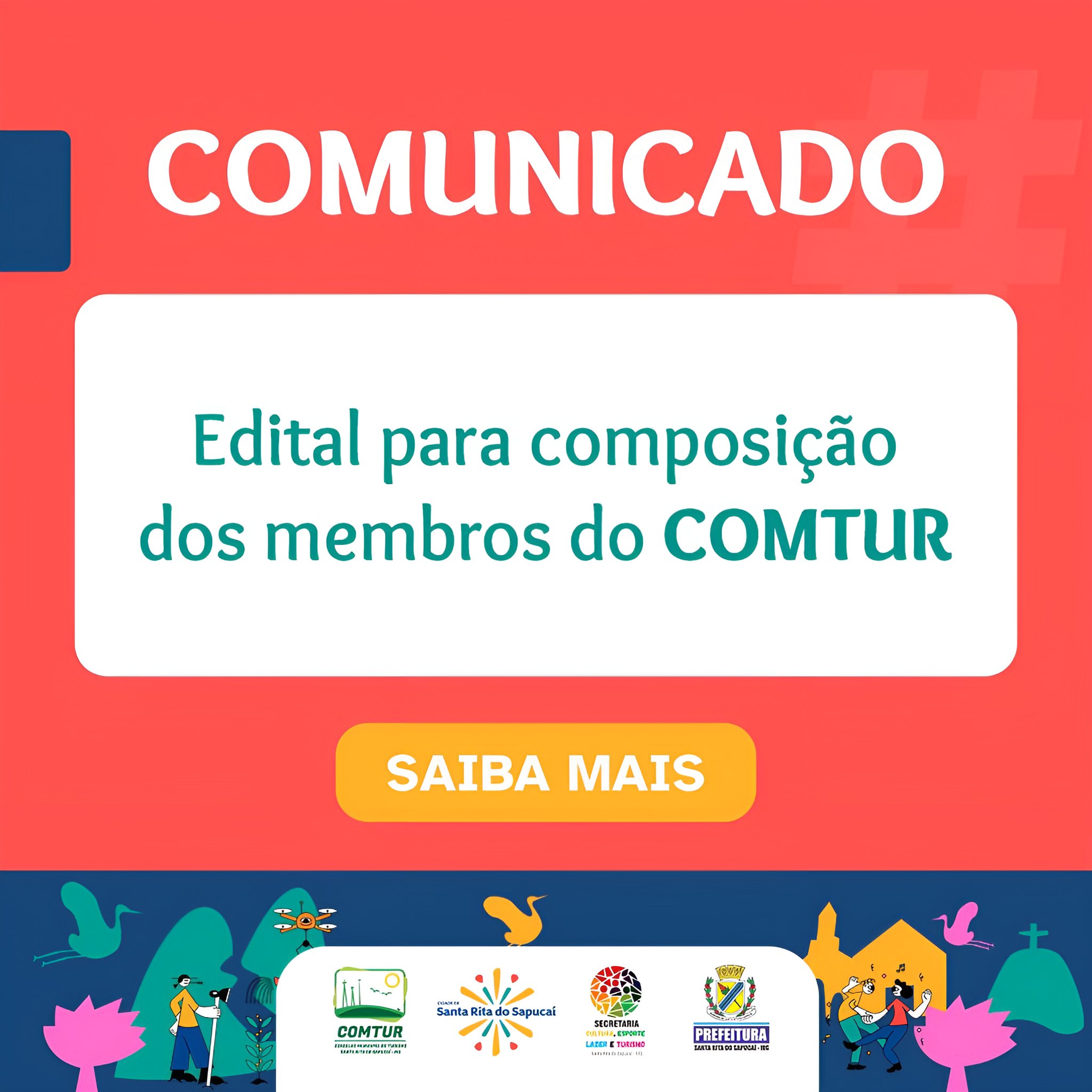 O Conselho Municipal de Turismo – COMTUR, em conformidade com os Artigos 6º e 7º do Regimento Interno do COMTUR, homologado pelo Decreto 15.263/2022, em consonância com a Lei 5.534/2022, torna público o Edital de Chamamento Público dos (das) representantes do segmento empresarial, organizações da sociedade civil (OSC) e membros da sociedade civil para composição do COMTUR – Gestão 2023/2024.