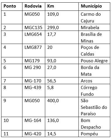 Com as novas praças, o Governo do Estado passa a ter 11 pontos em operação na malha rodoviária sob sua responsabilidade, conforme tabela a seguir.