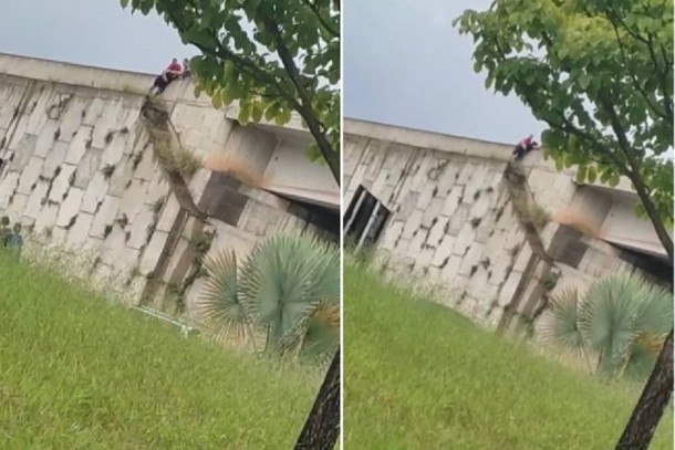 Nas imagens divulgadas, pode-se ver a mulher perigosamente já do outro lado da mureta de proteção, com os pés apoiados numa pequena plataforma e ameaçando se jogar ao solo de uma altura de cerca de 15 metros.