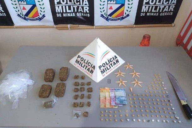 O adolescente foi apreendido com a droga: 4 tabletes grandes e 1 médio de maconha; 16 buchas de maconha; 115 pedras de crack; 26 pinos de cocaína e mais 1 faca com resquícios de drogas; R$ 47,00 em espécie e diversos sacolés vazios para embalagem dos produtos.