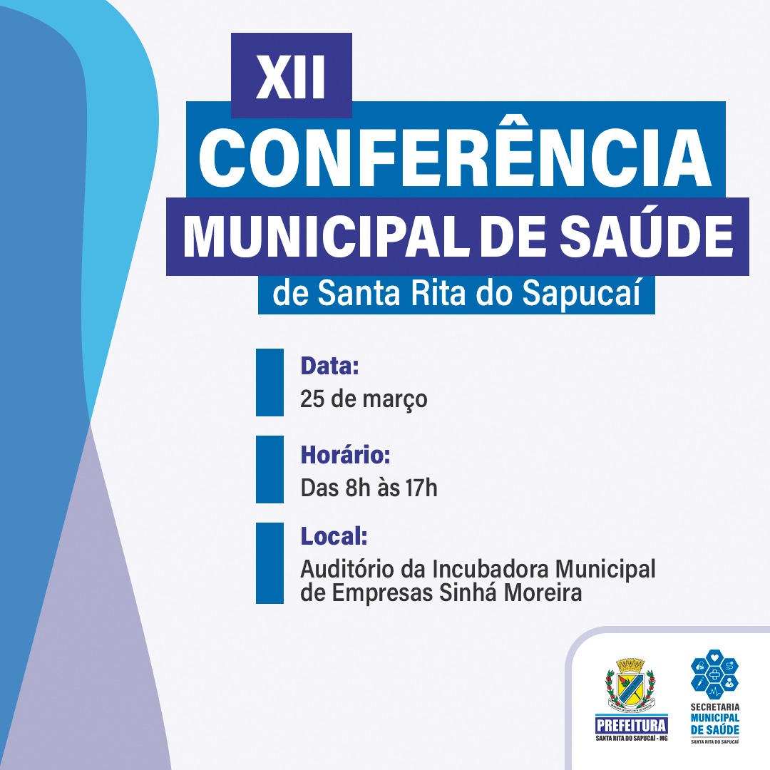 No dia 25 de março, a Secretaria de Saúde realizará a XII Conferência Municipal de Saúde de Santa Rita do Sapucaí com representantes da Prefeitura, entidades que prestam serviços de saúde para o SUS, trabalhadores do SUS, das entidades da sociedade que defendem os direitos dos cidadãos e dos próprios cidadãos para avaliar o SUS no município, em Minas Gerais e no Brasil e também apresentar sugestões de melhoria para a saúde pública local, estadual e nacional.