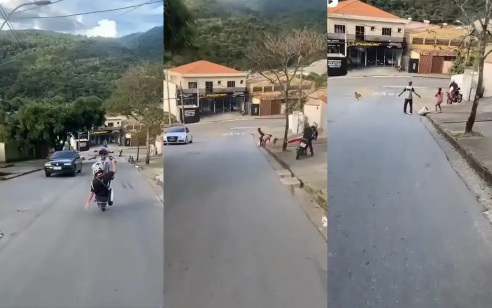 No flagrante das imagens dá para ver o momento exato em que o homem empina sua moto, desequilibra, invade a calçada e quase atinge dois pedestres e um cachorro.