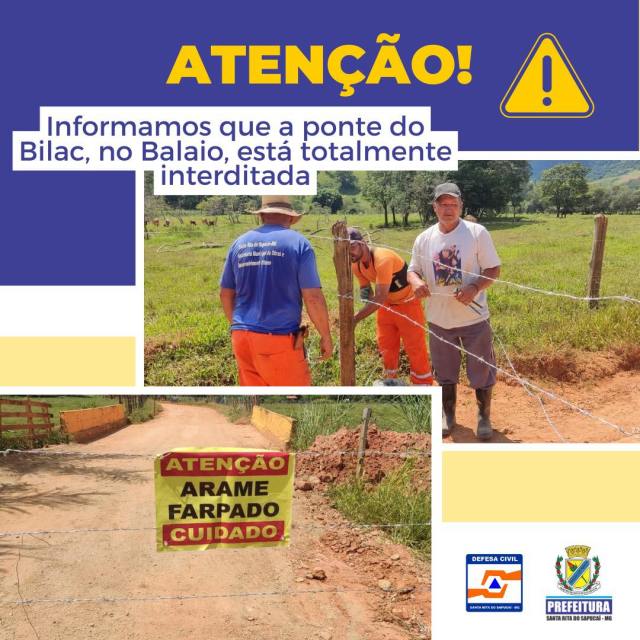 Informamos que a ponte do Bilac, no Balaio, está totalmente interditada para o trânsito de veículos de qualquer tipo, estando liberada apenas para pedestres e ciclistas.