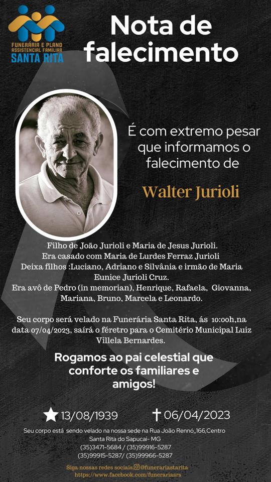 A família de Walter Jurioli, agradece especial atenção da equipe do Hospital Antônio Moreira da Costa, na pessoa da Drª. Lara Brusamolin, a fisioterapeuta Miqueline e toda a equipe do SAD.