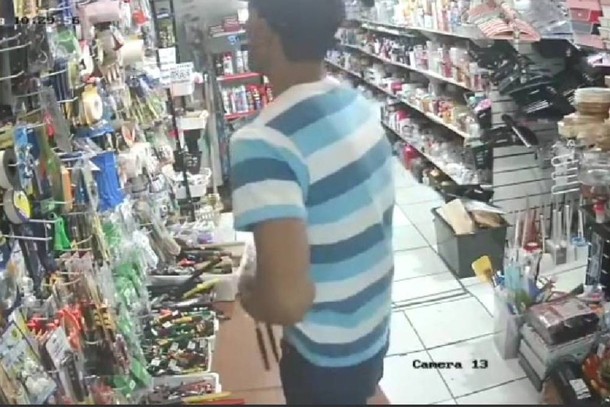 Ele se aproxima dos produtos em exposição, numa seção de pequenos objetos, olha à sua volta e após confirmar que não há ninguém próximo, começa a retirar produtos e colocar sob a camisa, presos entre o corpo e o cós da calça. Uma funcionária passa por trás dele e nada percebe. A atitude parece que chamou a atenção de outra funcionária, mas ele desconfia e sai às pressas, seguido dessa funcionária. Na calçada, conforme informações, ele apanhou uma bicicleta estrategicamente deixada no local e consegue fugir.