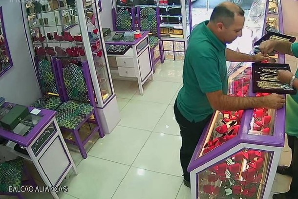 Foram disponibilizados para o autor dois mostruários contendo correntes, anéis e outras peças de ouro. As imagens mostram que, em certo momento, ele disfarça e, num movimento rápido, coloca algumas peças escondidas numa das mãos e depois as transfere para o bolso. Tudo ocorreu em segundos, sem que o proprietário percebesse.