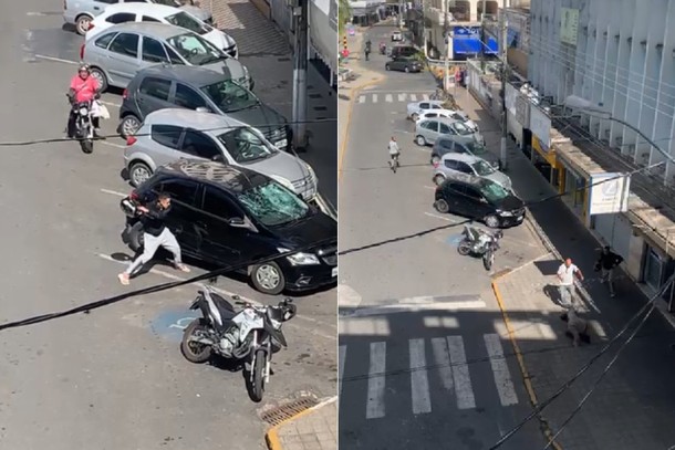 As informações sobre as causas do desentendimento ainda não foram divulgadas, mas as imagens mostram um jovem com um capacete agredindo o motorista de um veículo Ônix preto, estacionado próximo. Em seguida ele atinge o automóvel com vários golpes de capacete nas portas e para-brisa. Ato contínuo os dois entram em luta corporal e o carona da moto também agride o motorista.