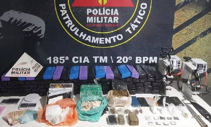 Em Pouso Alegre, a Polícia Militar prendeu um rapaz, de 23 anos, e apreendeu 110 barras de drogas entre maconha, cocaína e crack, além de porções das mesmas substâncias, dinheiro e uma arma.