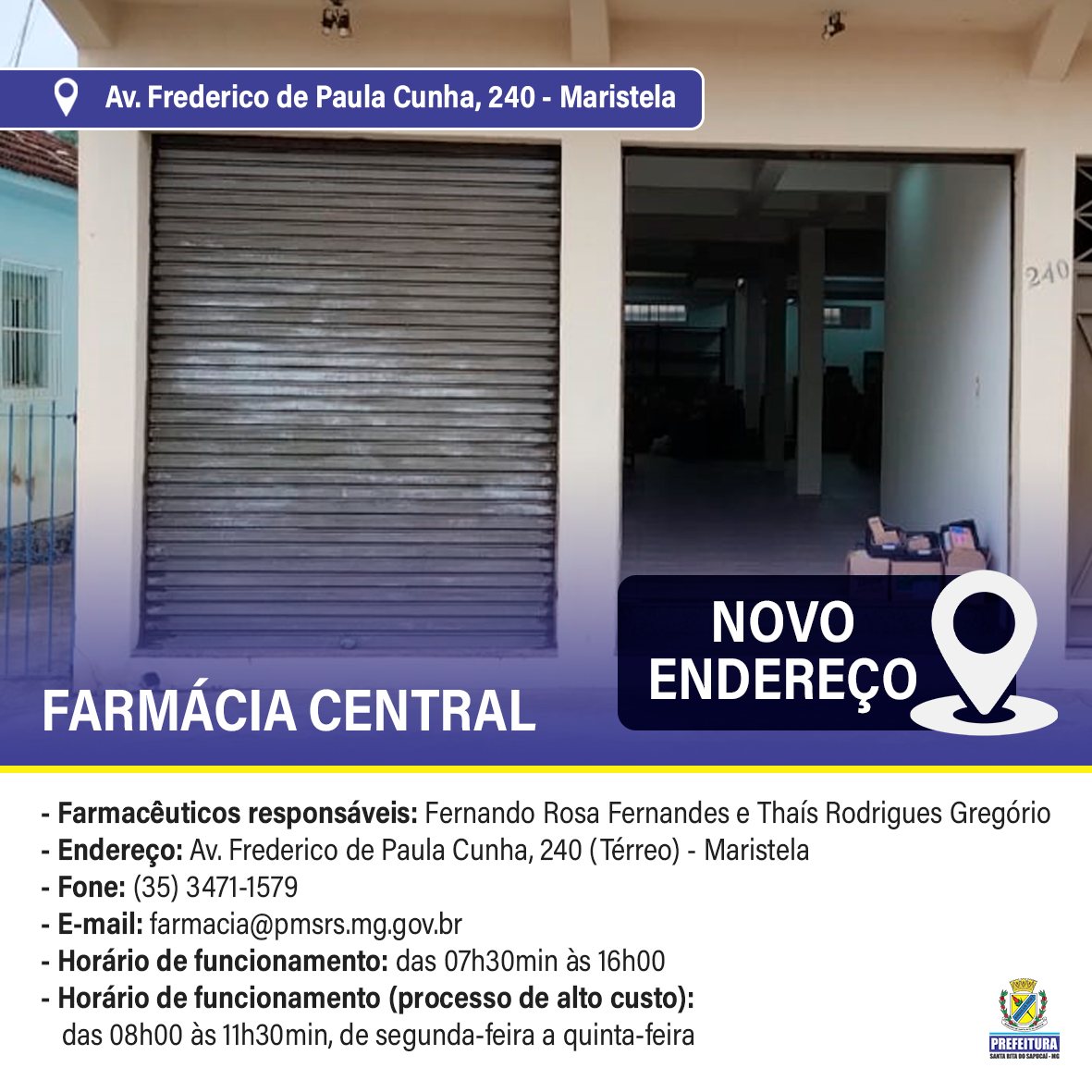 Em Santa Rita do Sapucaí, a Farmácia Central mudará de endereço a partir do dia 22 de junho, e passará a atender na Av. Frederico de Paula Cunha, 240 (Térreo) – Maristela.