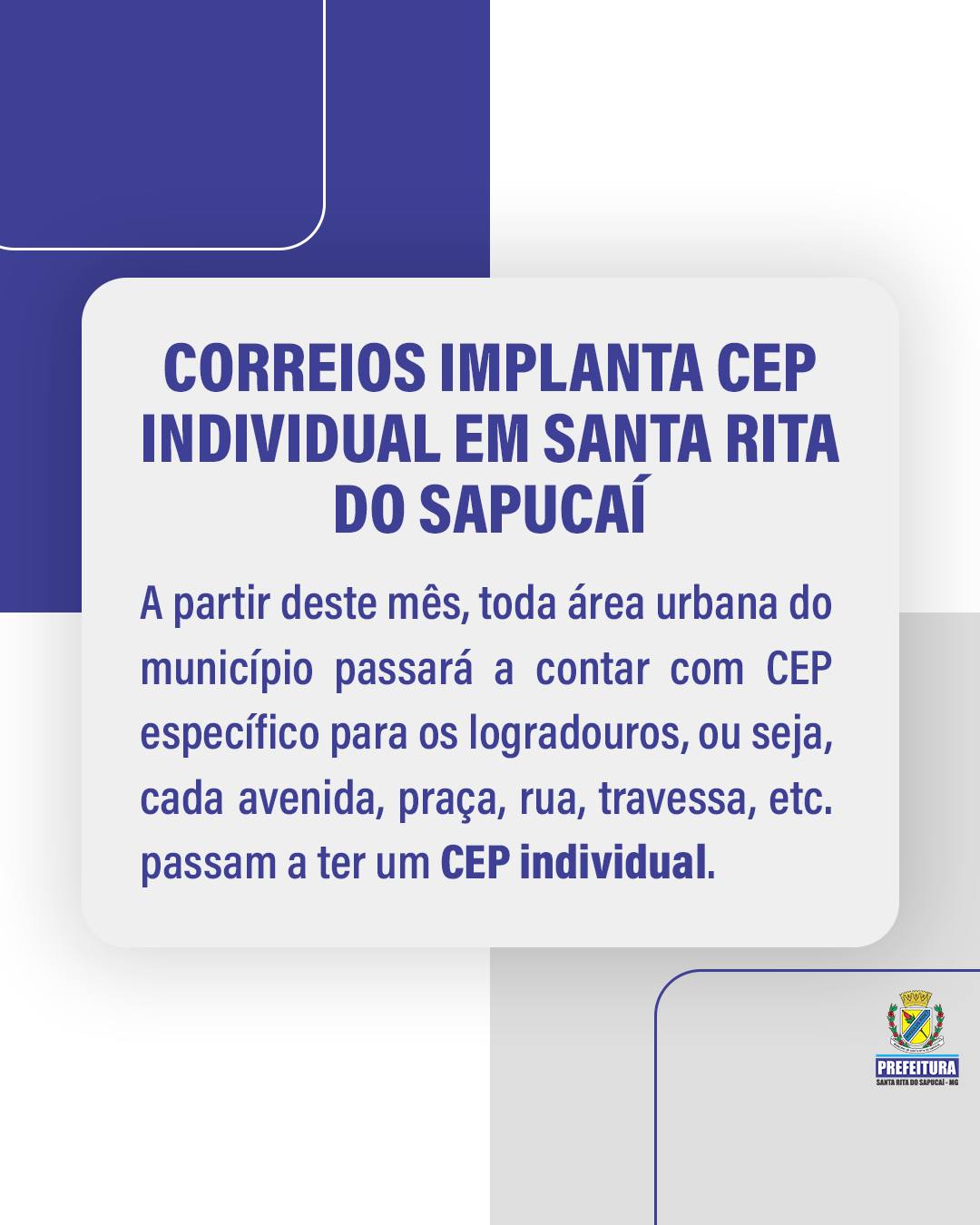 A partir deste mês, toda área urbana do município de Santa Rita do Sapucaí passará a contar com CEP específico para os logradouros, ou seja, cada avenida, praça, rua, travessa, etc. passam a ter um CEP individual.