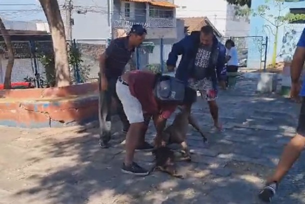As imagens de vídeo que circulou em redes sociais são fortes e mostram o animal furioso, massacrando o pequeno cachorro sob o seu domínio, mordendo-o enquanto as pessoas em volta tentavam interromper o ataque.