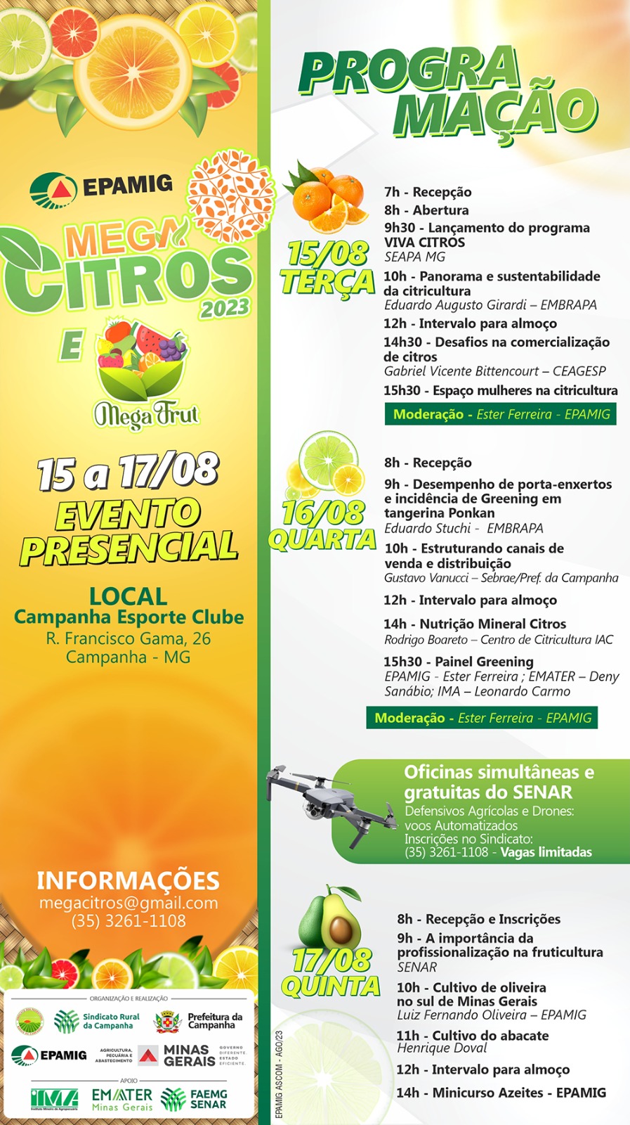 Minas Gerais é o segundo maior produtor de tangerina e limão, e o terceiro maior produtor de laranja do Brasil, com vários polos citrícolas no estado. Um deles está localizado na região Sul de Minas, no entorno do município de Campanha, onde a Empresa de Pesquisa Agropecuária de Minas Gerais (Epamig), em parceria com o Sindicato dos Produtores Rurais e a Prefeitura Municipal da cidade, realiza o Mega Citros 2023, entre os dias 15 e 17/8, a partir das 7h, no Campanha Esporte Clube.
