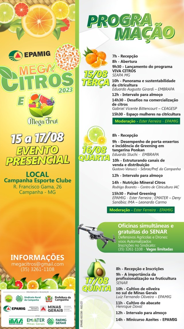 As inscrições gerais para o evento devem ser realizadas neste link. Mais informações pelo telefone (35) 3261-1108 ou pelo e-mail megacitros@gmail.com.