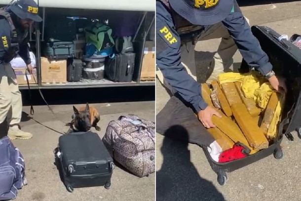 Dois cães treinados e que participam de operações de combate ao tráfico de drogas desencadeadas pela Polícia Rodoviária Federal, foram responsáveis por encontrar 10 kg de maconha que eram transportados ocultos numa mala no bagageiro de um ônibus de linha.