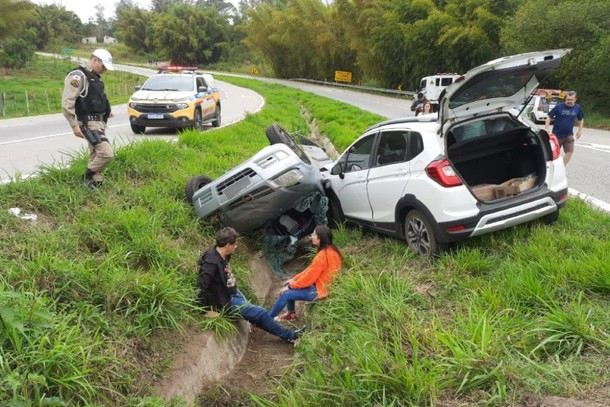Desrespeito à sinalização de trânsito, conforme apurou a Policia Militar Rodoviária, ocasionou uma colisão transversal entre dois automóveis no km 122 da BR-459, em trecho entre Pouso Alegre e Santa Rita do Sapucaí. Um dos veículos capotou com um casal. O acidente foi por volta das 11h deste sábado (16).