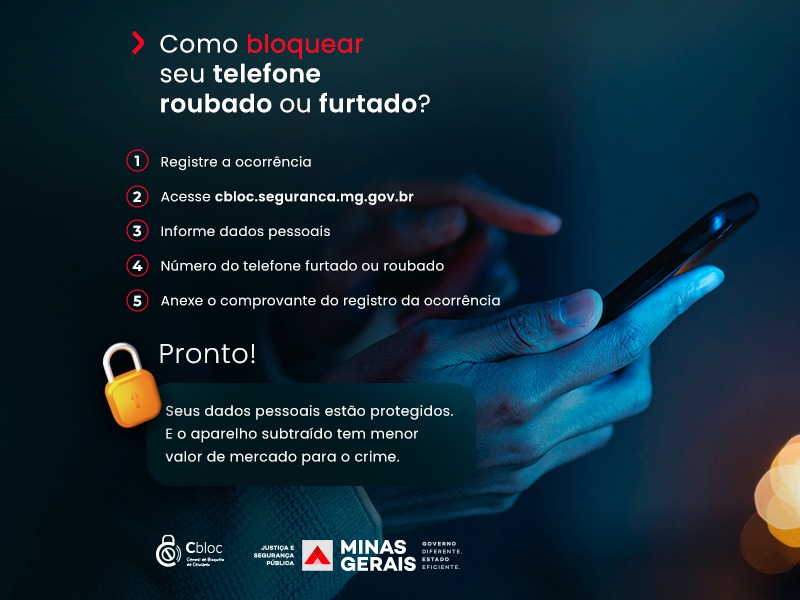 A Central de Bloqueio de Celulares de Minas Gerais (Cbloc) funciona de forma on-line e possibilita a inutilização do aparelho roubado ou furtado de forma imediata diminuindo seu valor de mercado. Além dos ganhos para a Segurança Pública, o cidadão que requer esse bloqueio por meio do endereço www.cbloc.seguranca.mg.gov.br, protege seus dados pessoais, já que diminui a chance de acesso a informações importantes como conversas em aplicativos de mensagens instantâneas, fotos ou caminhos diários salvos em aplicativos de GPS, para citar alguns exemplos.