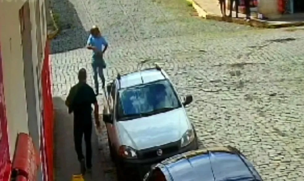 As imagens mostram um homem de chapéu e blusa azul com uma sala de plástico na mão atravessando o cruzamento. Na esquerda, aparece um homem de camisa preta com um malote.