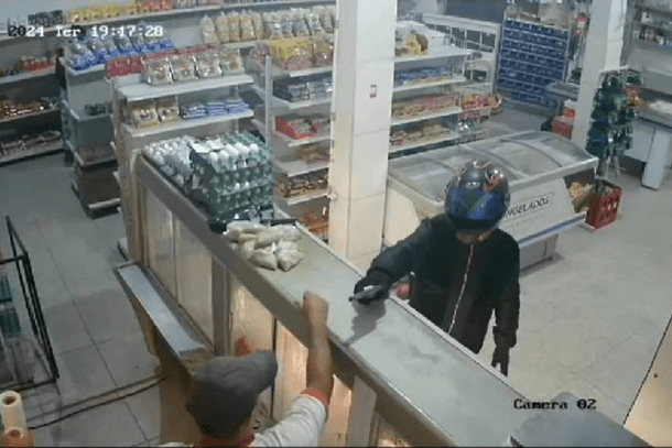 As cenas seguintes foram gravadas e as imagens do vídeo mostram o homem entrando no estabelecimento e anunciando o assalto para a proprietária e o marido. Ela atendia a uma outra mulher no caixa e o marido se encontrava mais ao fundo, atrás do balcão. O assaltante apontou uma arma de fogo e exigiu que a vítima entregasse o dinheiro e as chaves de uma motocicleta que estava estacionada na porta da mercearia.