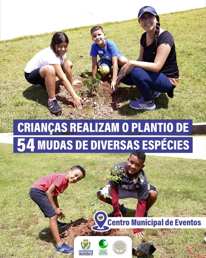 Crianças realizam o plantio de 54 mudas de diversas espécies no Centro Municipal de Eventos