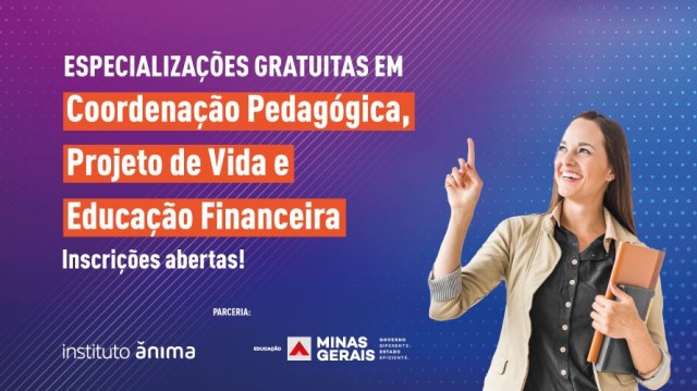 A Secretaria de Estado de Educação de Minas Gerais (SEE/MG), em parceria com o Instituto Ânima, vai oferecer, gratuitamente, formações para o aprimoramento dos profissionais da rede estadual de ensino. Estão disponíveis três especializações em Coordenação Pedagógica, Projeto de Vida e Educação Financeira, sendo que as duas últimas já estão abertas desde o ano passado. Essa é mais uma ação de formação continuada e gratuita, que contempla agora os especialistas em Educação Básica (EEB). Ao todo são 1.500 vagas distribuídas entre os três cursos, que têm a duração total de um ano. O prazo para se inscrever vai até 14 de fevereiro.