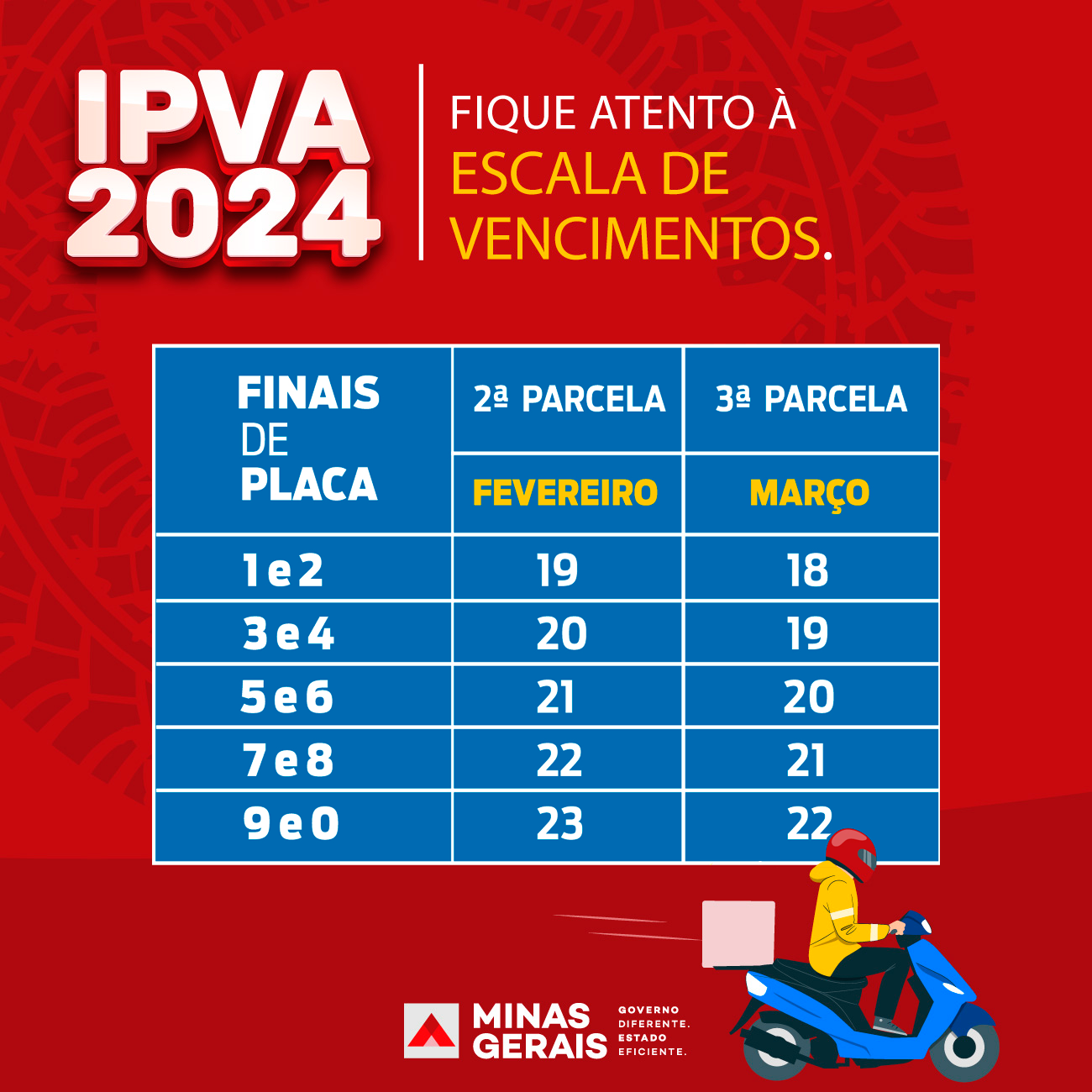 Para os proprietários que optaram pelo pagamento parcelado do IPVA 2024, a segunda parcela do imposto deve ser paga na próxima semana, em Minas Gerais. A escala de vencimento começa na segunda-feira (19/2), pelos finais de placa 1 e 2, e se encerra na sexta-feira (23/2), pelos finais 9 e 0.