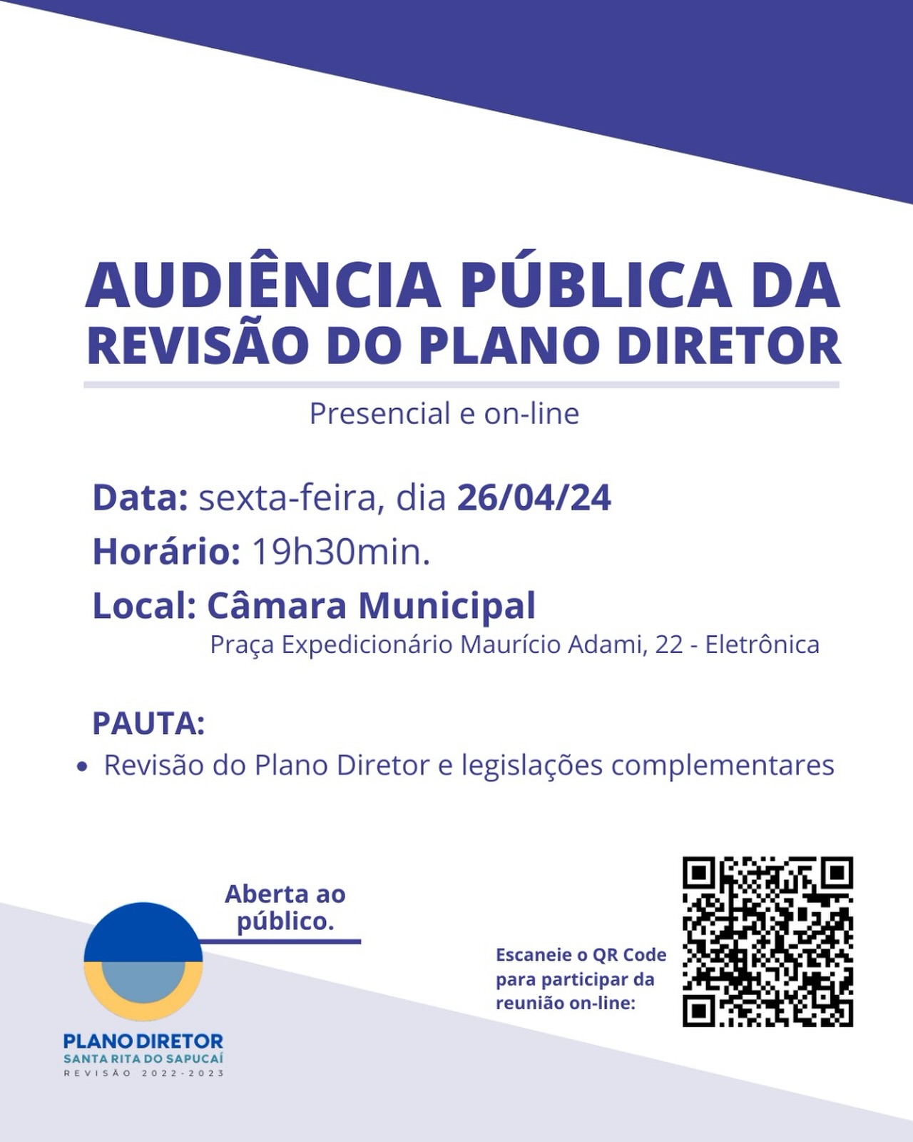 Esta reunião será realizada tanto presencialmente, quanto on-line através do Facebook da Câmara Municipal de Vereadores: https://www.facebook.com/camaramunicipaldesantaritadosapucai