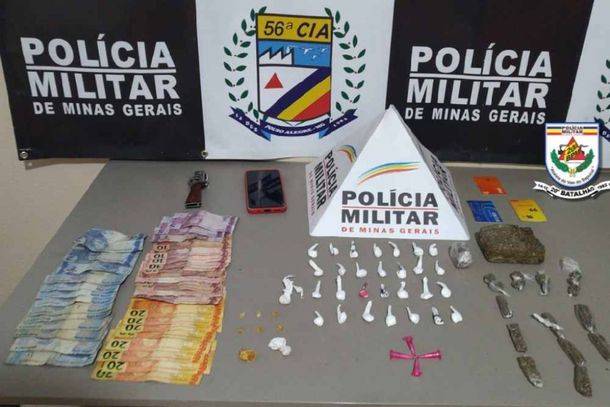 Foram apreendidos uma barra e um tablete de maconha, 17 buchas da mesma droga, duas pedras grandes de crack e seis pequenas, um canivete com resquícios de maconha, além de vale alimentação em nome de terceiros, utilizado para trocar em drogas, um celular, dinheiro e objetos pessoais como relógios, pulseiras e anéis.