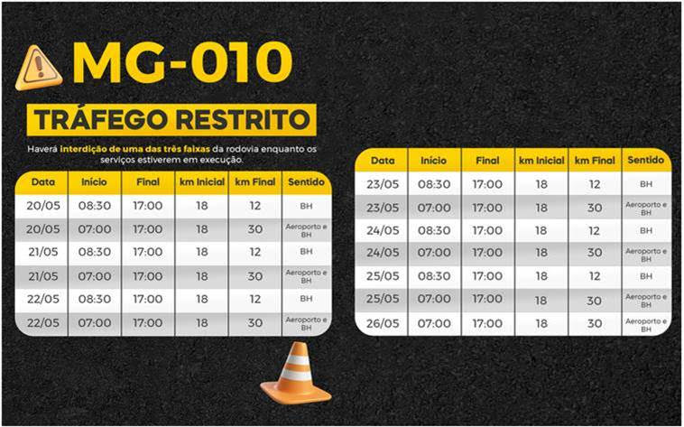 O Departamento de Estradas de Rodagem de Minas Gerais (DER-MG) informa a programação semanal das melhorias na rodovia MG-010. Essas intervenções são realizadas para manter as condições de segurança viária ao longo do trecho, que inclui revitalização da sinalização horizontal e vertical e dos dispositivos de segurança viária da rodovia, localizada no vetor norte da Região Metropolitana de Belo Horizonte (RMBH).